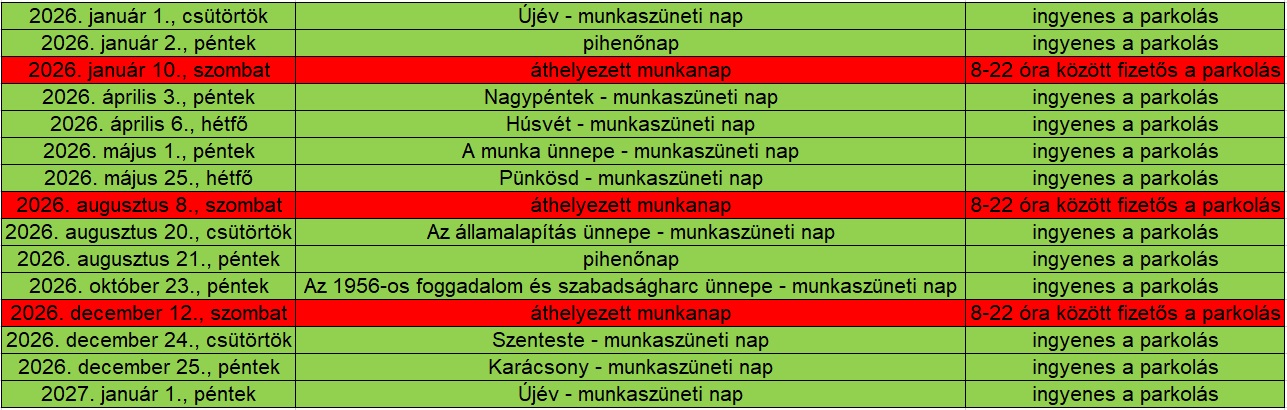 Amennyiben magasabb szintű jogszabály a naptár szerinti munkarendtől eltérésként szombati munkavégzést ír elő, úgy ezeken a szombati napokon is a fent részletezett díjköteles várakozási időszakot kell alkalmazni. A munkaidő beosztásának munkaszüneti napok miatt indokolt változtatását a gazdaságfejlesztési miniszter évenként szabályozza. A miniszter rendelete alapján a 2026. évben az alábbi szombati napra eső munkanapokon kell parkolási díjat fizetni: